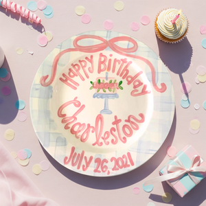 Personalized Preppy Girl's 1st Birthday Plate - Blue Gingham & Bow - BCP05